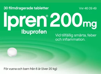 Ipren, filmdragerad tablett 400 mg 30 st används vid lindrig till måttlig smärta. Produkten är även febernedsättande samt inflammationshämmande. För vuxna och barn från 12 år. Ipren kan användas exempelvis vid ont i ryggen, ledvärk, feber under förkylning eller för att lindra besvär orsakade av artros eller reumatoid artrit. Effekt fås i regel inom 30 minuter efter intag och maximal effekt nås inom ca 1-2 timmar. Tabletten är filmdragerad vilket gör den lättare att svälja.